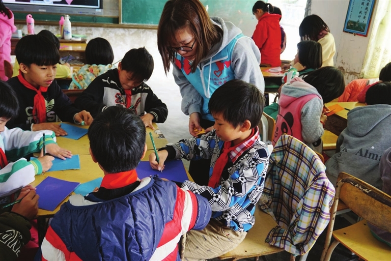 上学期寒假期间,郑心盈作为志愿者之一,前往肇庆桂村开展义教。图为她在义教期间,给学生们上手工课。图由受访者提供