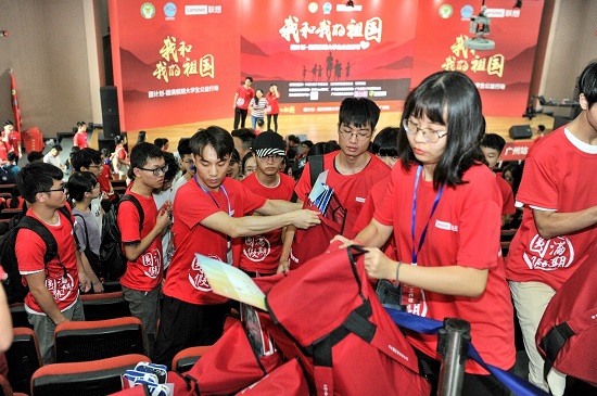 大学生志愿者领取爱心背包,准备出发