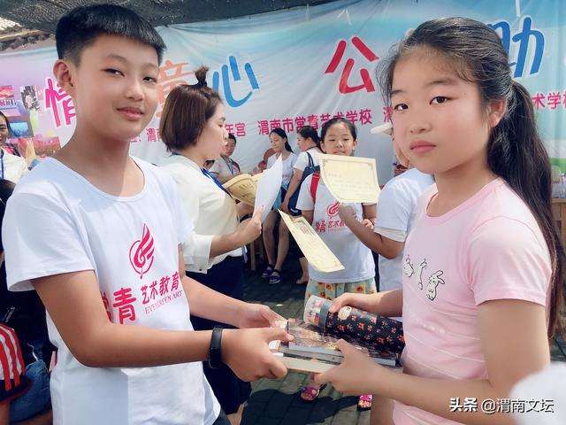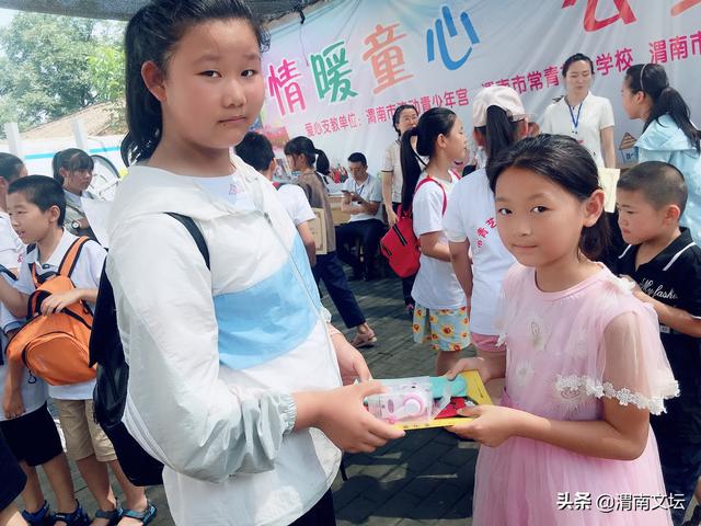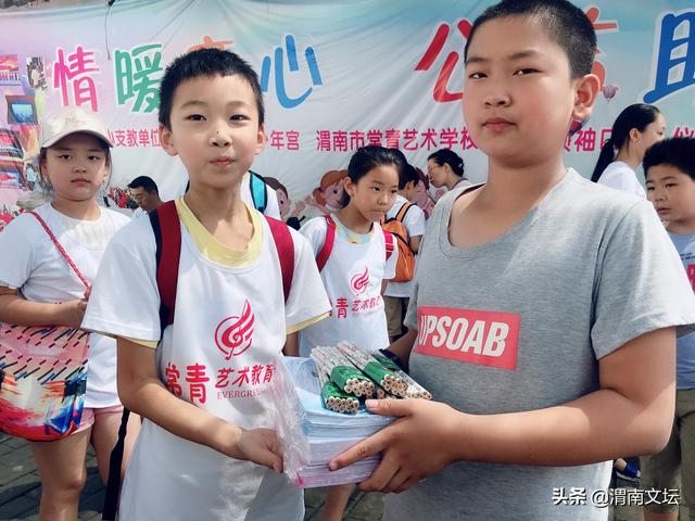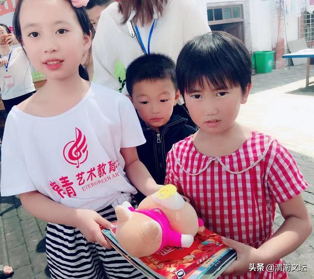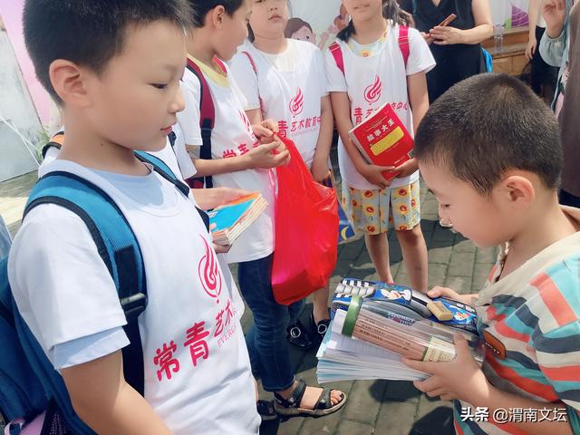 捐赠环节开始了,孩子们自觉排好队,左边一队是桥南留守儿童们,右边一队常青艺术学校的孩子们。看到 常青的孩子们精心为留守儿童准备的礼物,我被深深的感动了。那些漂亮的书包、崭新的本子、精美图书,精致 的文具,可爱的玩具、小电扇、还有精心制作的友谊卡、书画作品......无不饱含着常青艺术学校孩子对桥南留守儿 童的关爱之情!友谊的种子在小小少年心中悄悄发芽,为常青有爱心的小天使们点赞!为老师们的引导点赞!为 家长们的默默支持点赞!