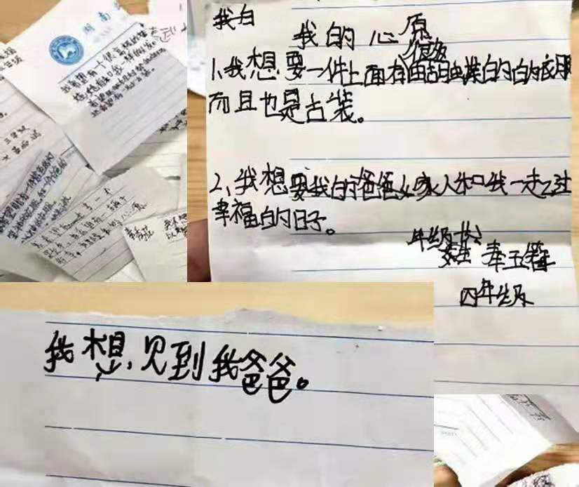 “我想见到我爸爸。”一位三年级的小朋友写了这么让人动容的小愿望。“我不想要妈妈那么累了,我希望我能快点长大,这样就能帮助妈妈做事了。”三年级的奉秀花写下了自己的心愿。