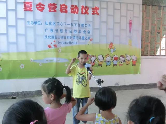 7月26日,广州市从化区农村留守儿童之家创建示范点暨“城乡儿童手拉手,幸福一齐走”夏令营在吕田镇三村村胜利开营!原广州市委常委、广州市关工委执行主任孔少琼,原广东省民政厅副巡视员、广东省慈泉公益基金会顾问方炎松,广州市慈泉集团副总经理李文强,广州市关工委第一副主任陈万鹏、广州市关工委常务副主任容小梨,从化区关工委执行主任霍燕娥,从化区委组织部副部长、区委老干部局局长庾美金,从化区关工委常务副主任陈长卿、李树根,广东省慈泉公益基金会副理事长兼秘书长苏婷,从化区委老干部局副局长路秋霞,吕田镇党委副书记陈伟广等,还有40多名三村留守儿童、广州市城市学生及其家长监护人代表、三村村村干部及村民们、三下乡大学生志愿者等100多人参加了本次启动仪式!