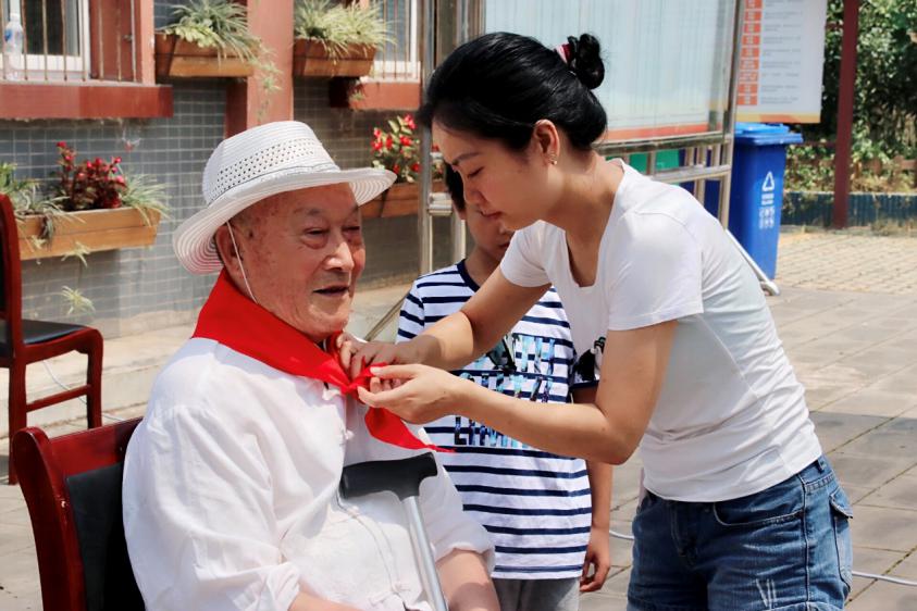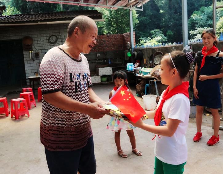 走访结束之后,在新添镇党群服务中心广场,城乡儿童联谊共同奉献了一场精彩纷呈的慰问演出。曾经参加过抗美援朝和昌都剿匪的老兵代表,89岁的付志圣和79岁的陶明族爷爷被邀请上台,向孩子们回忆了中国共产党的建党建国历程。当儿童代表为爷爷戴上红领巾并敬队礼时,爷爷说:“孩子们要铭记历史,铭记有国才有家,珍惜现在幸福生活的来自不易 。”此时,现场人员全体起立向爷爷敬礼,向祖国致敬。此时此刻,城乡人民同心相系,不分彼此,大家在“八一”建军节来临之际,尽情抒发敬党爱国、友邻和睦的大爱传递之情。