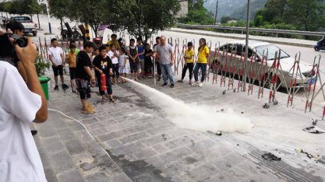 到达室外之后,队员王凯凡又为孩子们亲身示范灭火器的的使用方法。“拔下保险销,左手握住喷管,右手握住提着压把,在距火焰两米的地方,右手用力压下压把,左手拿着喷管左右摇摆,直至把火全部扑灭”王凯凡边讲解边操作着使用灭火器的每一步骤。孩子们站在一边聚精会神的看着。看过一遍之后,向豪阳同学也跃跃欲试,他严格遵守着王老师示范的每一步骤,随着干粉的喷出,火成功地被熄灭。向豪阳高兴地说:“以前从来没有使用过灭火器,今天真的涨知识了”谈到使用灭火器的技巧,王凯凡介绍道,“其实并不难。拔栓、握紧、对准火源,不要害怕也别慌张就行了。”